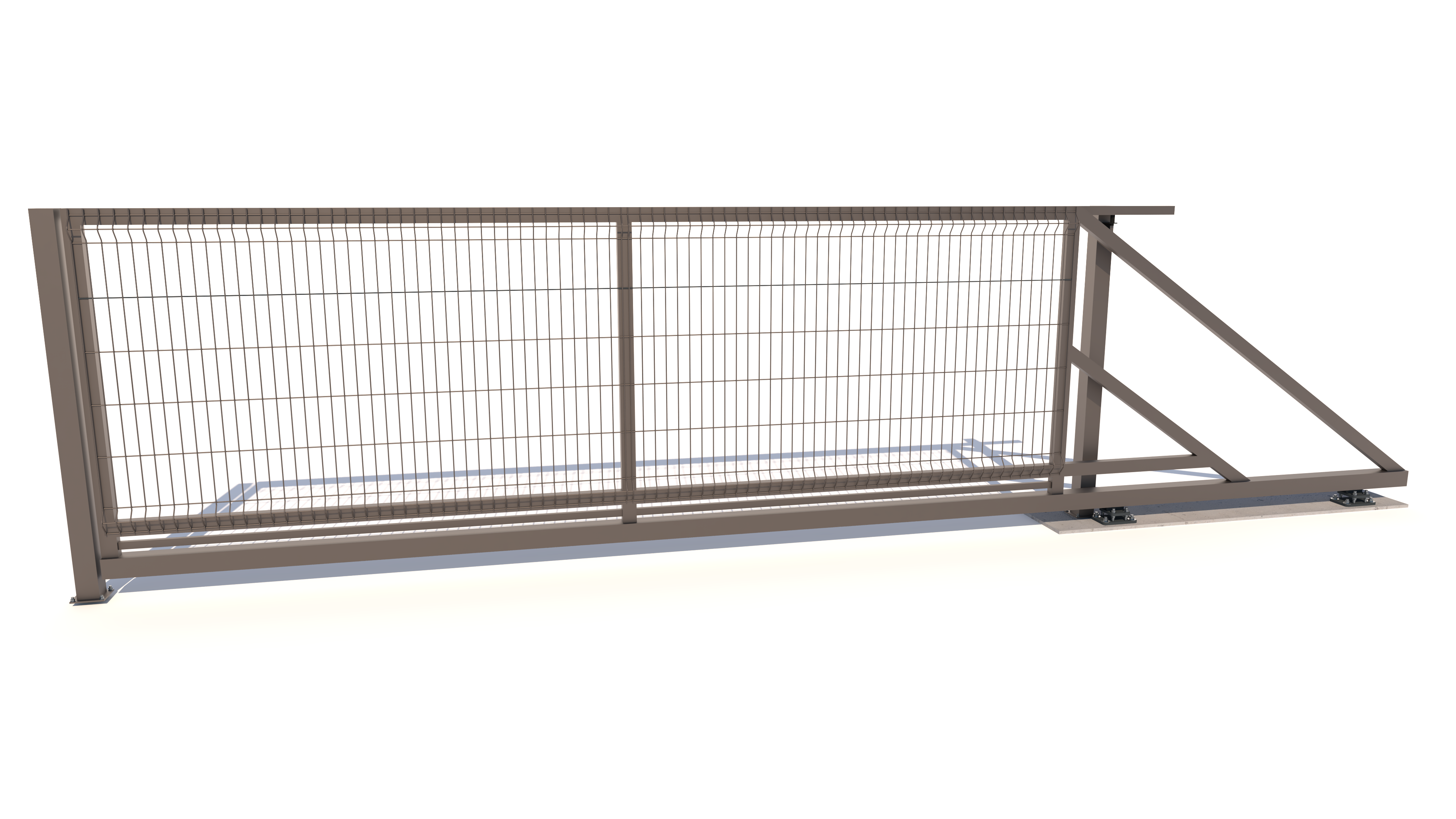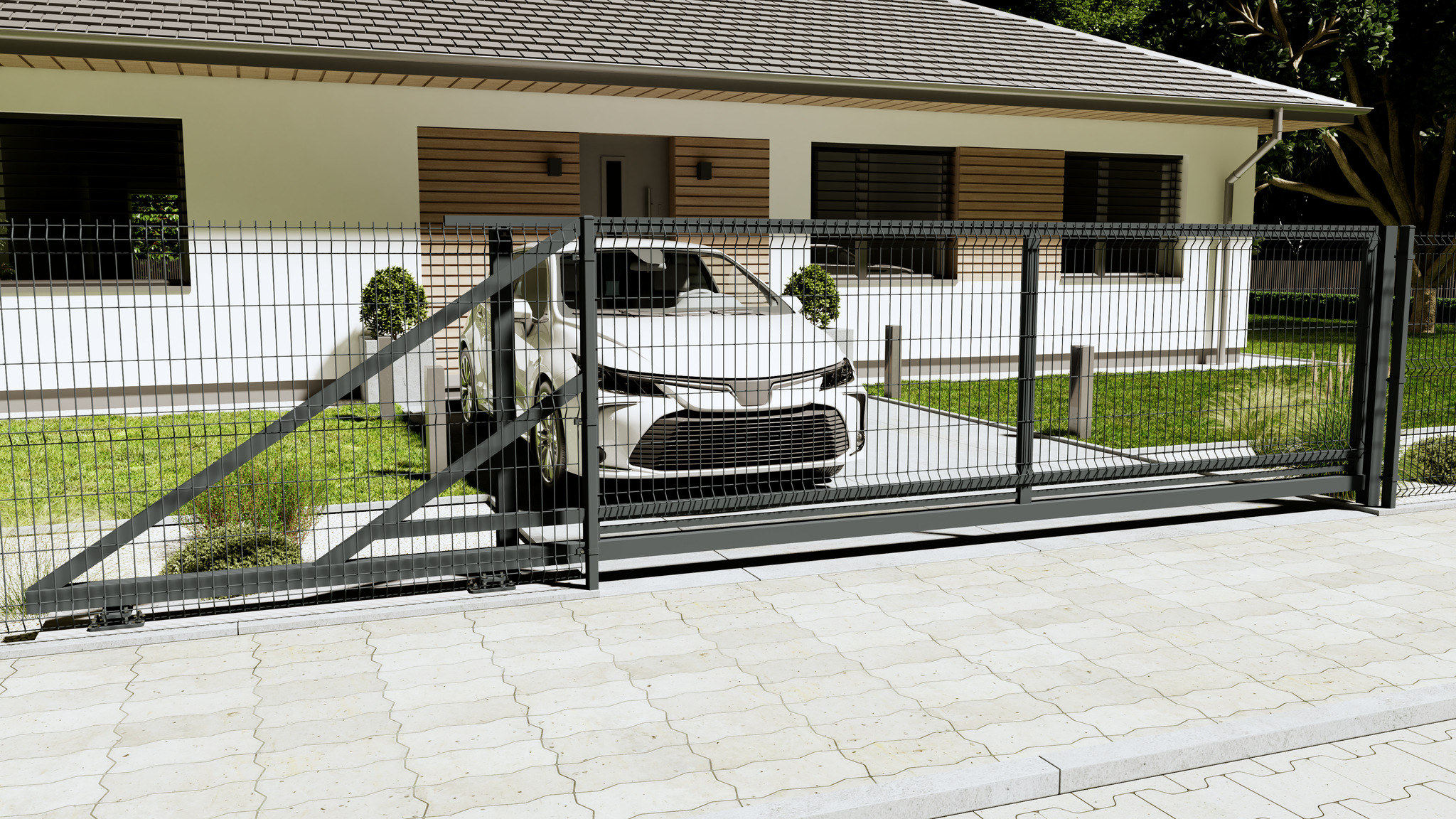Brama przesuwna samonośna z wypełnieniem z siatki panelowej 3D to doskonałe połączenie estetyki i funkcjonalności. Oczka siatki mają wymiary 50x200 mm, a solidna konstrukcja z drutu o grubości 5 mm zapewnia trwałość i bezpieczeństwo.